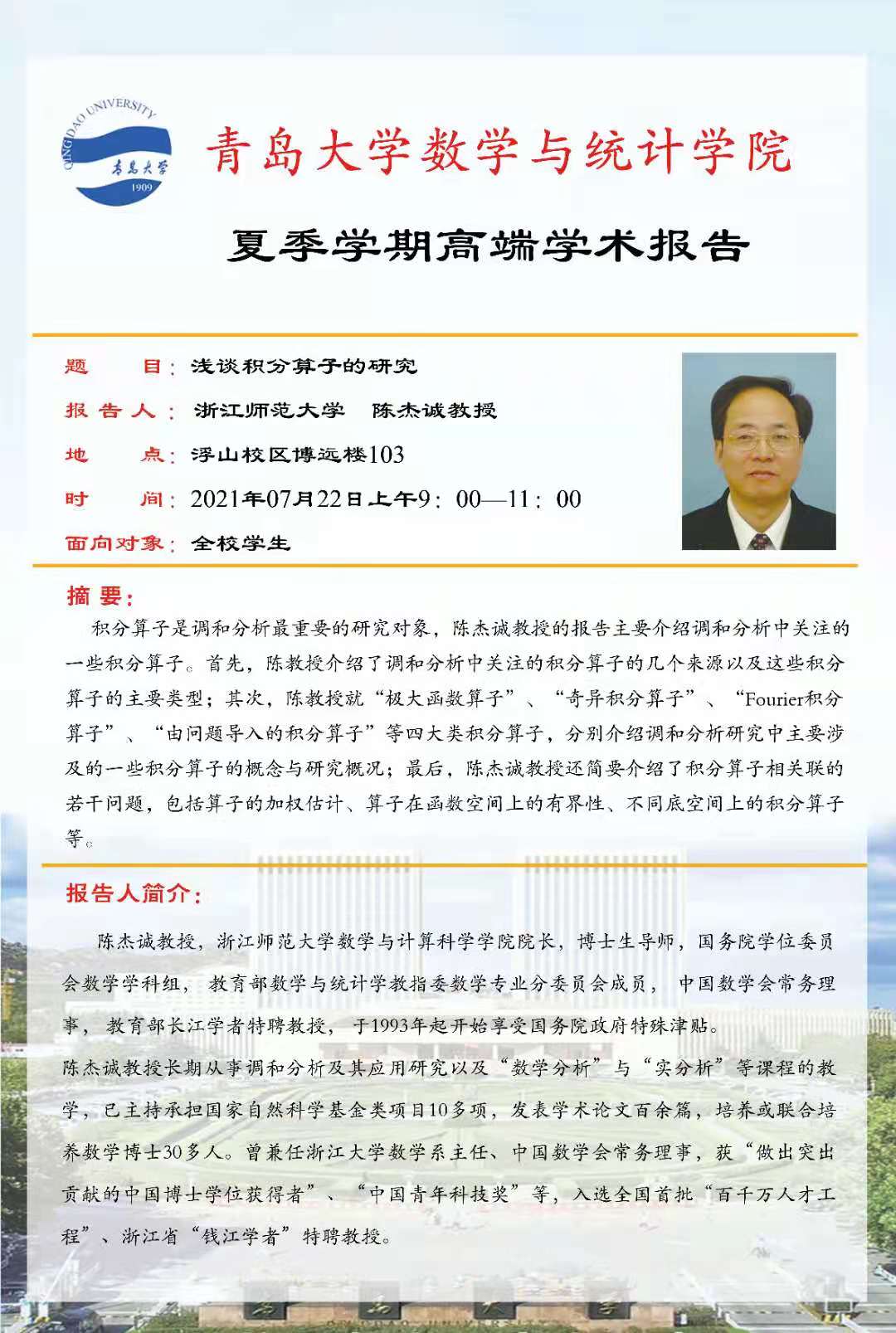 2021年7月22日9:00-11:00,YABO鸭脖官网夏季学期第九场高端学术报告在国际学术交流中心崇德厅举行,来自浙江师范大学的教育部数学与统计学教指委数学专业分委员会委员陈杰诚教授为YABO鸭脖官网师生作了题为:“浅谈大学数学”的学术报告。