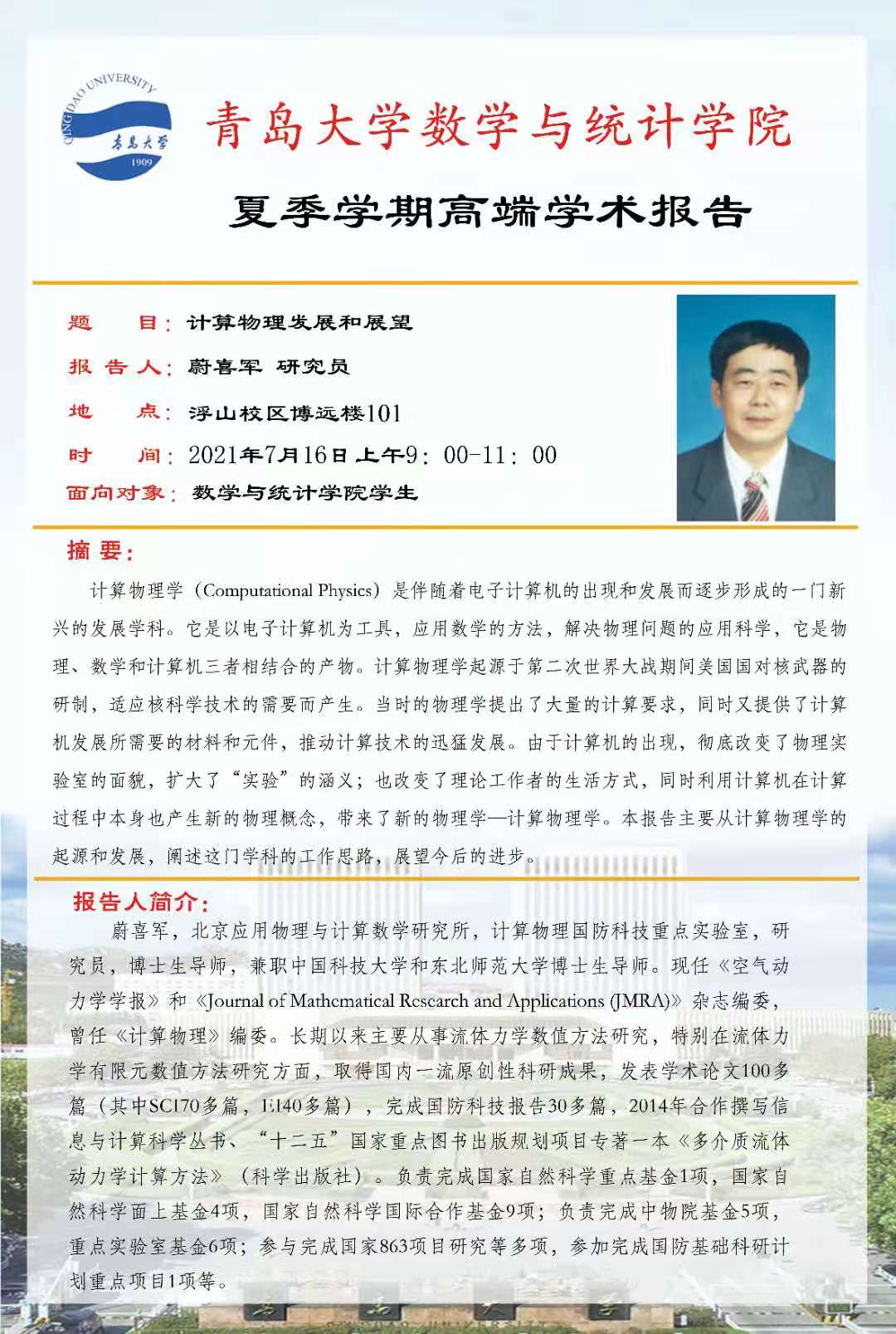 2021年7月16日9:00-11:00,YABO鸭脖官网夏季学期第四场高端学术报告在博远楼101教室举行,来自北京应用物理与计算数学的蔚喜军研究员为YABO鸭脖官网师生作了题为“计算物理发展和展望”的学术报告,介绍了计算物理的历史和未来的发展。