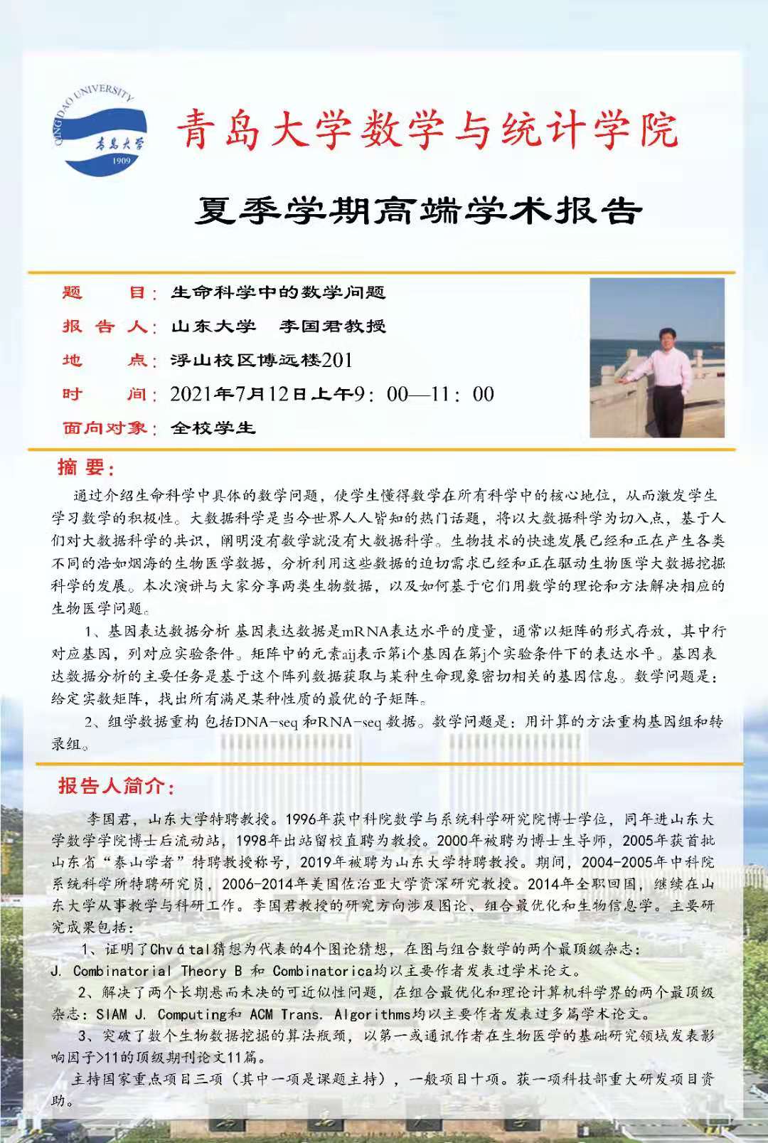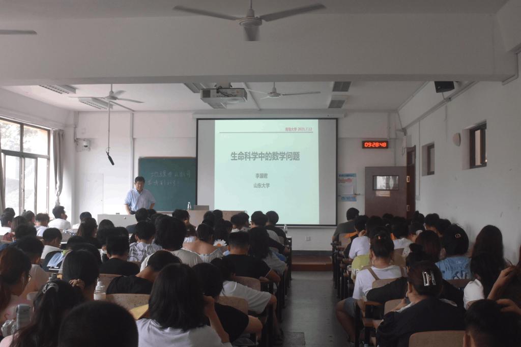 2021年7月12日9:10-11:50,YABO鸭脖官网夏季学期第二场高端学术报告在博远楼201教室举行,来自山东大学的泰山学者李国君教授为YABO鸭脖官网师生作了题为“生命科学中的数学问题”的学术报告,通过介绍生命科学中具体的数学问题,使学生懂得数学在所有科学中的核心地位,从而激发学生学习数学的积极性。