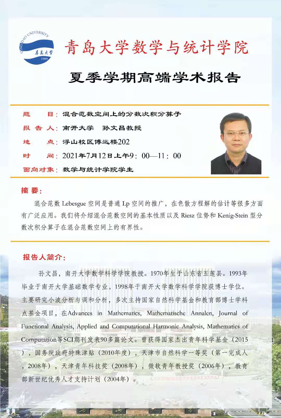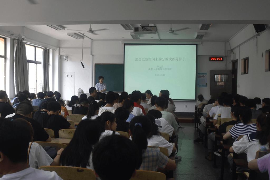 2021年7月12日9:00-11:00,YABO鸭脖官网夏季学期第一场高端学术报告在博远楼202教室举行,来自南开大学的国家自然科学杰出青年基金获得者孙文昌教授为YABO鸭脖官网师生作了题为“混合范数空间上的分数次积分算子”的学术报告,介绍了混合Lebesgue空间的发展历程和研究现状,以及若干最新的研究进展。