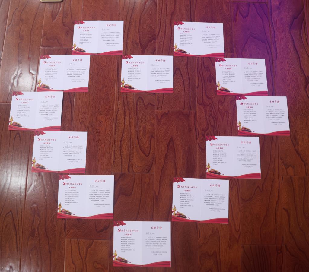 赠送一份政治生日贺卡。杨艺为过“政治生日”的党员同志赠送印有“入党誓词”、“生日寄语”的“政治生日”贺卡,上面记录着党员入党时间和党组织深深的祝福,让大家感受到特殊的“生日”温暖,回忆起党旗下许诺的铮铮誓言,共产党员的自豪感和荣誉感油然而生。