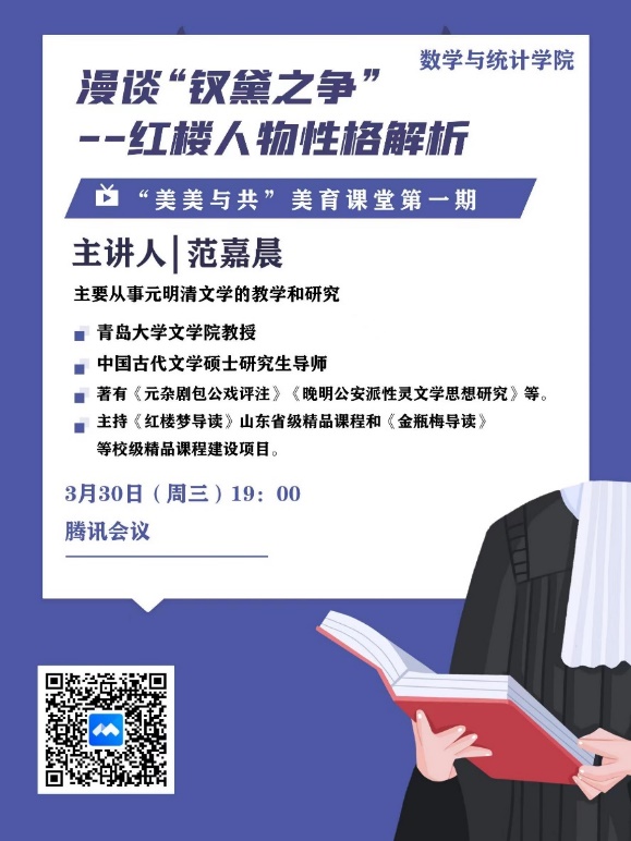 3月30日晚19:00,YABO鸭脖官网举办“美美与共”线上美育课堂,邀请YABO鸭脖官网优秀教授文学院范嘉晨教授为全体师生带来一场别开生面的文学讲座——红楼人物性格解析之漫谈“钗黛之争”。YABO鸭脖官网党委副书记张雪蕾主持讲座。