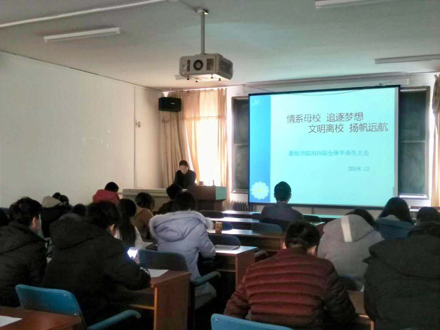 会上,李玲慧首先结合习近平总书记在改革开放40周年大会上的重要讲话精神,倡议同学们向改革先锋学习,牢记习近平总书记对广大青年的希望,增强本领,不忘时代使命,树立远大理想。然后从就业派遣、省内外签约、解约流程、就业形式等方面详细介绍了毕业手续。强调同学们在就业过程中要充分利用学校发布就业信息的相关平台,积极参加招聘会,不断提高自身的就业能力,发挥就业优势,更好、更快的找到理想工作。