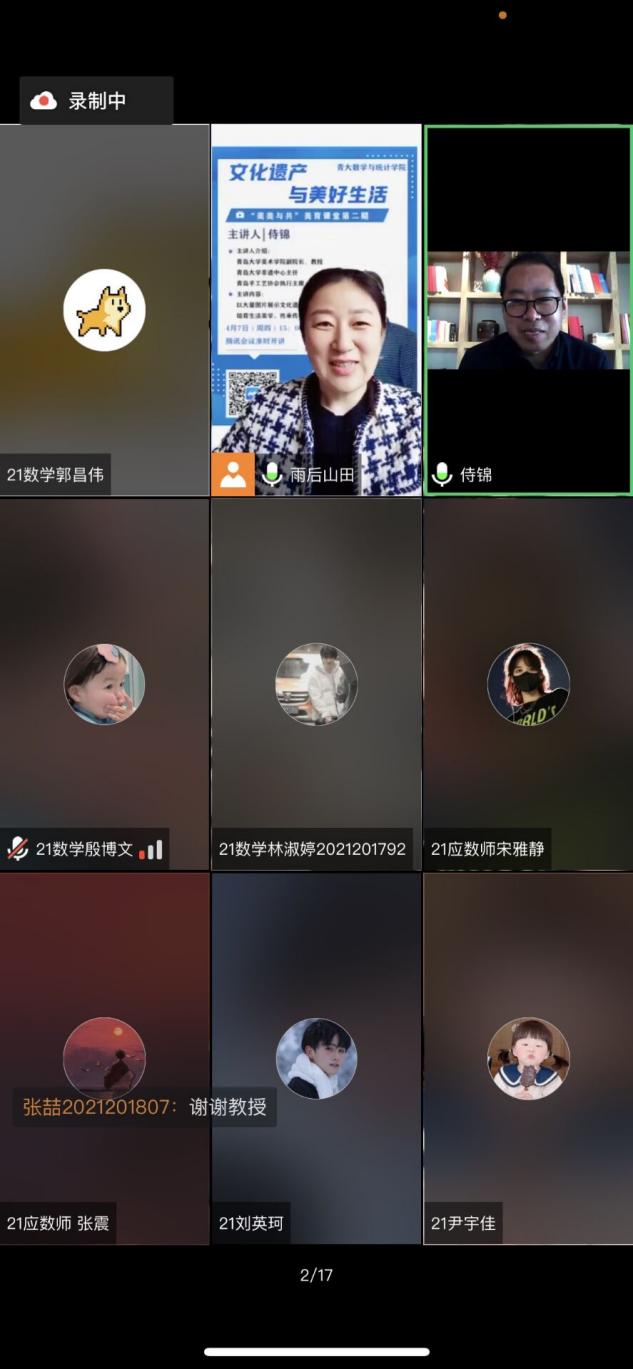 2022年4月7日下午3点,YABO鸭脖官网举办“美美与共”美育课堂第二期,邀请到YABO鸭脖官网美术学院副院长、YABO鸭脖官网非遗中心主任、青岛手工艺协会执行主席侍锦教授,主讲“文化遗产与美好生活”线上讲座。活动由学院党委副书记张雪蕾主持,全院学生积极参与。