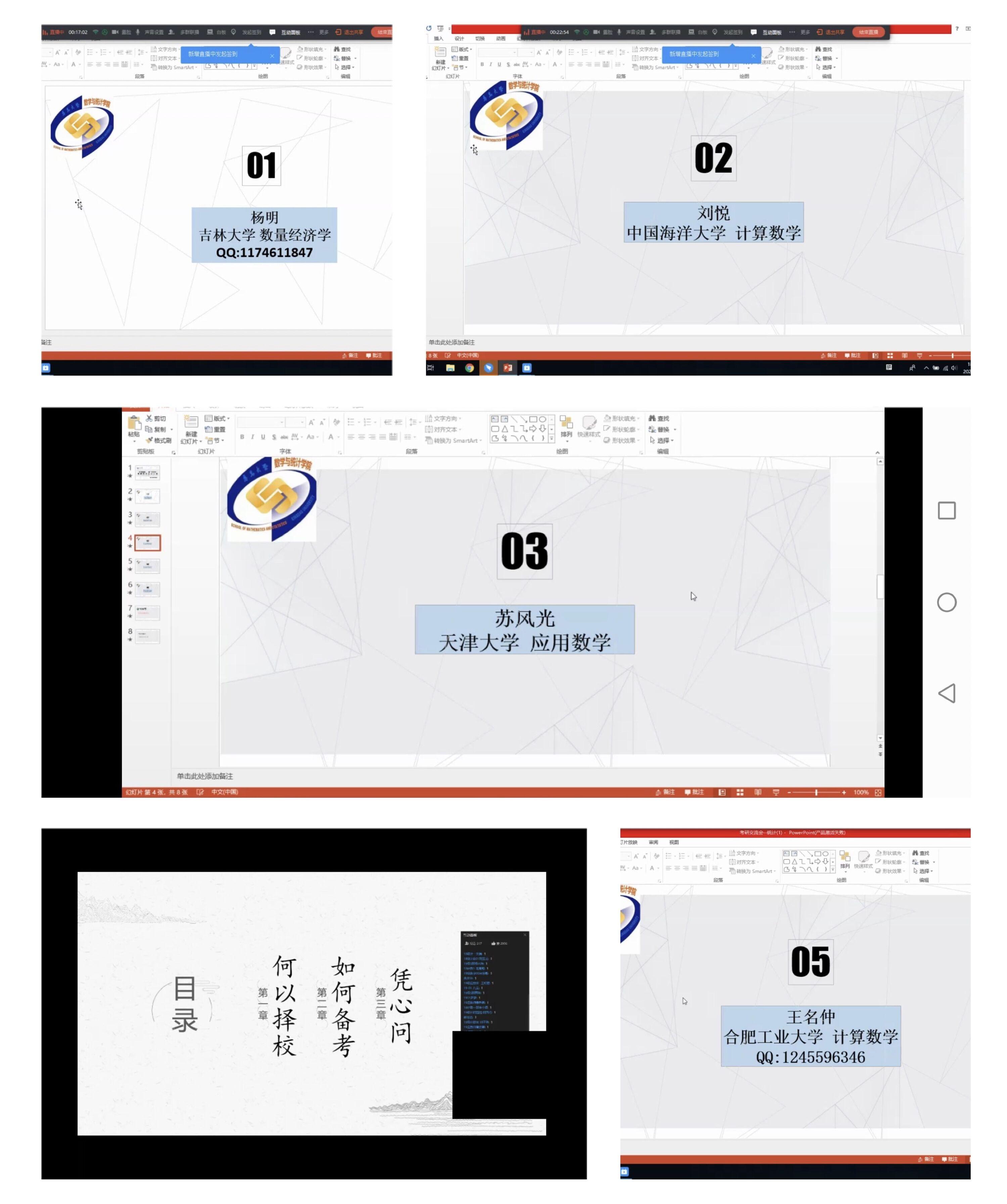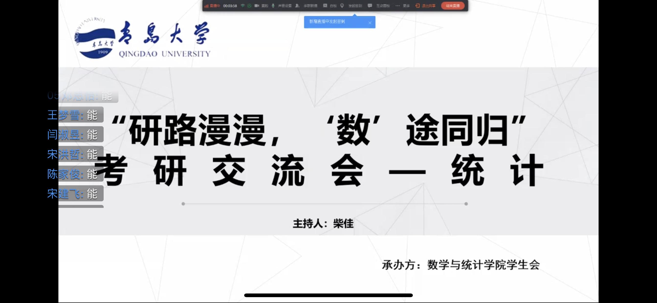 6月3日,为期四天的“研路漫漫,‘数’途同归”考研交流会线上活动圆满结束。本次活动邀请了十多位成功上岸的优秀毕业生给同学们分享考研的经验与得失。
