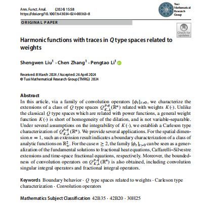 近日,YABO鸭脖官网2021级数学与应用数学专业本科生刘盛文以第一作者在《Annals of Functional Analysis》上发表题为“Harmonic functions with traces in Q type spaces related to weights”的长篇研究论文,(https://doi.org/10.1007/s43034-024-00363-8)。该杂志是泛函分析与调和分析领域中的SCI期刊。指导教师和通讯作者为李澎涛教授。