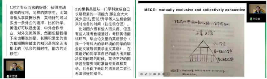 为培养多学科交叉融合型人才,增强学生人文素养,12月1日13:30,YABO鸭脖官网“数学与人文”系列讲座第三讲——“当Math碰上English,如何共赴一场学习的邂逅”线上开讲。本次讲座由YABO鸭脖官网公共外语教育学院孙亚楠副教授主讲,YABO鸭脖官网2022级全体学生认真听会学习。
