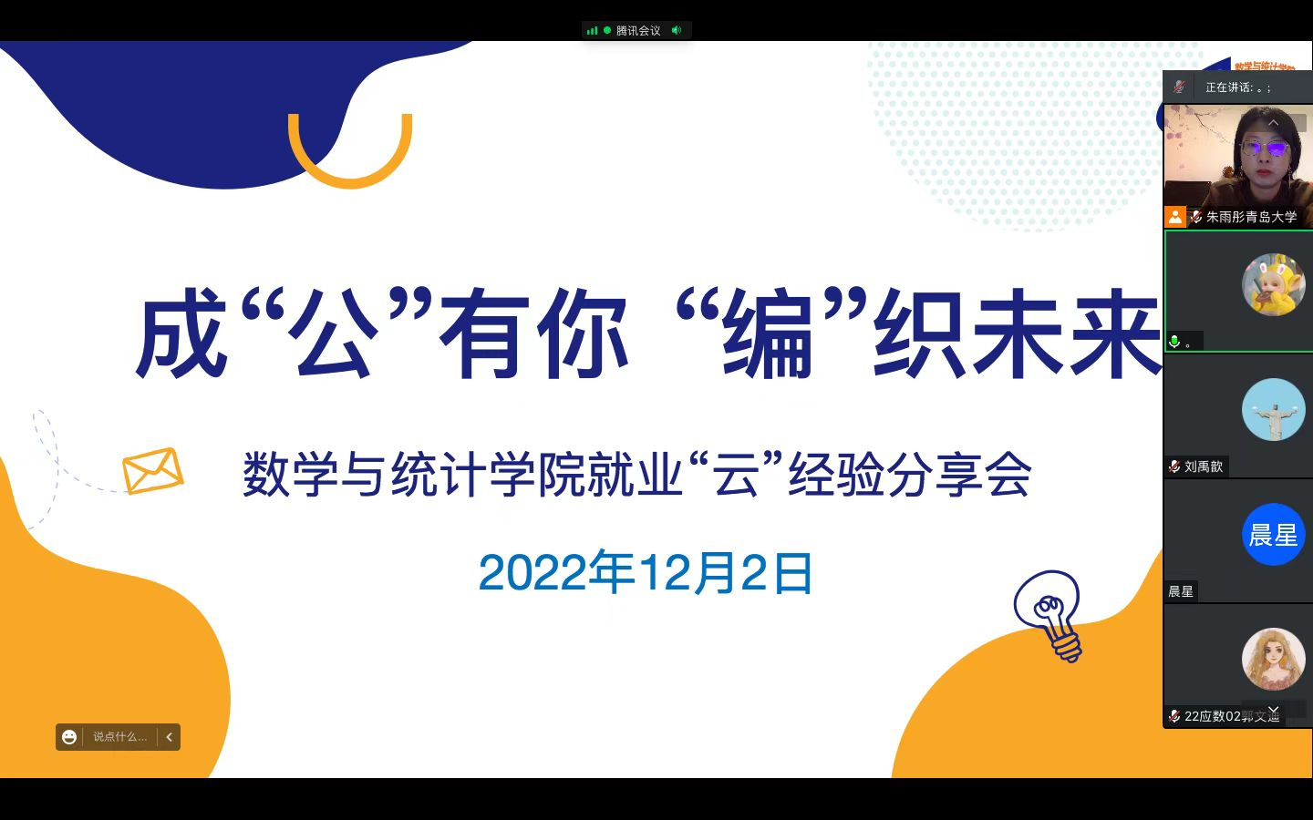 为进一步提升我院应届毕业生求职就业能力,帮助有意向考公、考编的学生更高效备考,12月2日19:00,YABO鸭脖官网线上举办主题为“成‘公’有你,‘编’织未来”的就业“云”经验分享交流会,邀请到黄旸、崔丹丹、刘星、王春荣、田昌源五位优秀毕业生进行就业经验分享。院党委副书记魏小平、团委书记朱雨彤参与会议,本次会议由朱雨彤主持,本院学生积极参会听会。