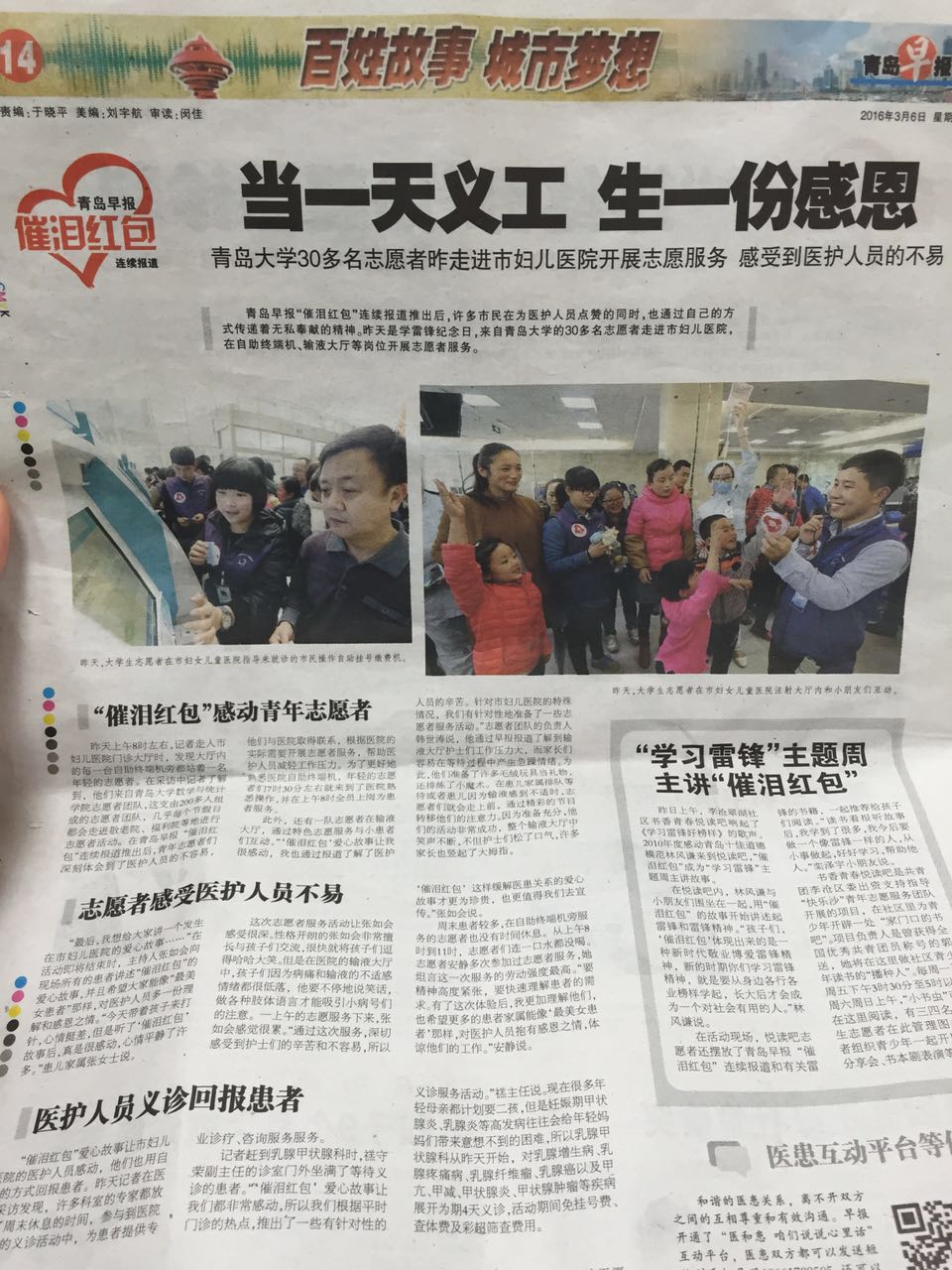 为响应校团委的号召,学习榜样力量,YABO鸭脖官网团委义工队于3月5日在青岛妇女儿童医院积极开展以“学习雷锋精神,践行榜样力量”为主题的学雷锋活动。青岛市妇女儿童医院党委书记、院长任明法代表全体员工对YABO鸭脖官网义工队志愿者一行表示热烈欢迎。