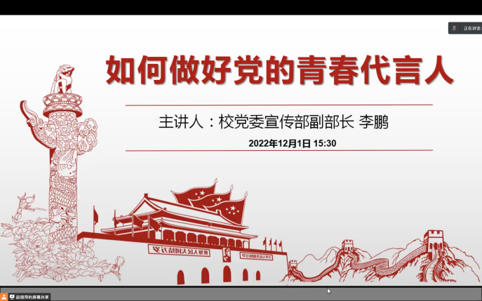为了提高学生骨干的综合素养,12月1日15:30,YABO鸭脖官网“如何做好党的青春代言人”主题讲座线上举行。YABO鸭脖官网邀请到校党委宣传部副部长李鹏主讲本次讲座,YABO鸭脖官网全体本科生班级骨干及学生会骨干积极参会。
