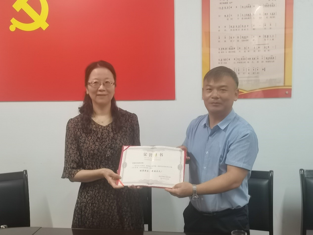 姜永杰向退休教师孙丽强颁发荣退证书,并代表学院表示祝贺,对她扎根教育事业38年,认真履行教书育人职责,长期在教育工作岗位上辛勤工作和做出的贡献表示感谢。他指出退休教师既是学院事业发展的建设者,又是学院历史发展的见证者。他们身上所展现出的崇高品质、教育情怀、工作作风和职业操守,都是学院宝贵的精神财富。希望孙丽强老师退休以后,保持身心健康,退休不褪色,离岗不离校,一如既往地关心支持学院工作,为学院的发展贡献智慧和力量。